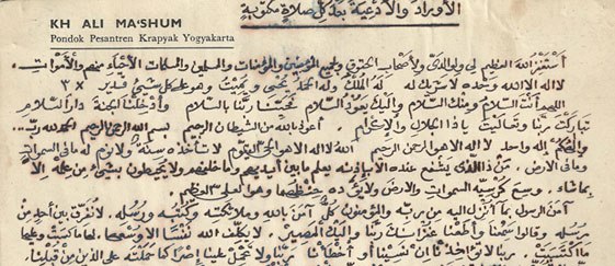 Ini adalah salinan pindaian naskah kenangan tulisan tangan langsung Simbah KH Ali Maksum, rahimahullah. Berisi bacaan-bacaan yang rutin dibaca setelah melaksanakan shalat fardlu, atau yang lebih dikenal dengan awrad (tunggal : wirid). Di dalam khasanah budaya Islam selain bacaan wirid kalimah tayyibah seperti yang ada dalam catatan tersebut, wirid-wirid lain banyak ditulis oleh para kiyai, ulama atau awliya’.