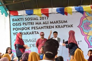 Organisasi Intra Sekolah (OSIS) MA Ali Maksum sukses menyelenggarakan kegiatan bakti sosial. Agenda tahunan OSIS tersebut pada kali ini diselenggarakan di Kabupaten Magelang. Kegiatan tersebut dilangsungkan di dua lokasi secara bersamaan selama dua hari (14-15/10). Lokasi pertama bertempat di Dusun Sendaren I, Desa Karangrejo, Kecamatan Borobudur. Sementara itu, lokasi kedua kedua tidak jauh dari lokasi pertama dan masih dalam satu desa, yaitu di Dusun Kurahan.